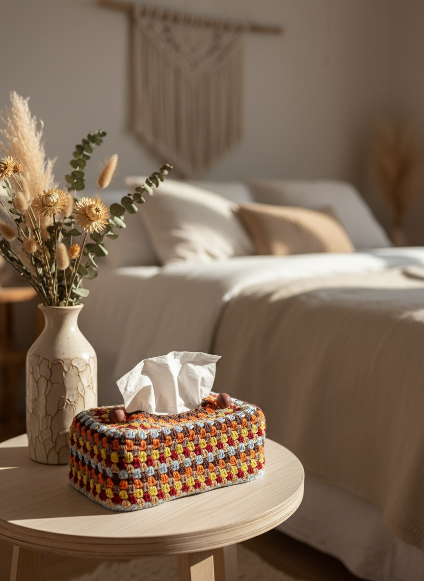 Transform your everyday tissue box into a stunning decorative accent with this vibrant handmade crochet cover. Featuring a rich palette of brown, orange, beige, yellow, burgundy, and blue cotton yarn, this artisan piece brings warmth and bohemian charm to any room in your home.
