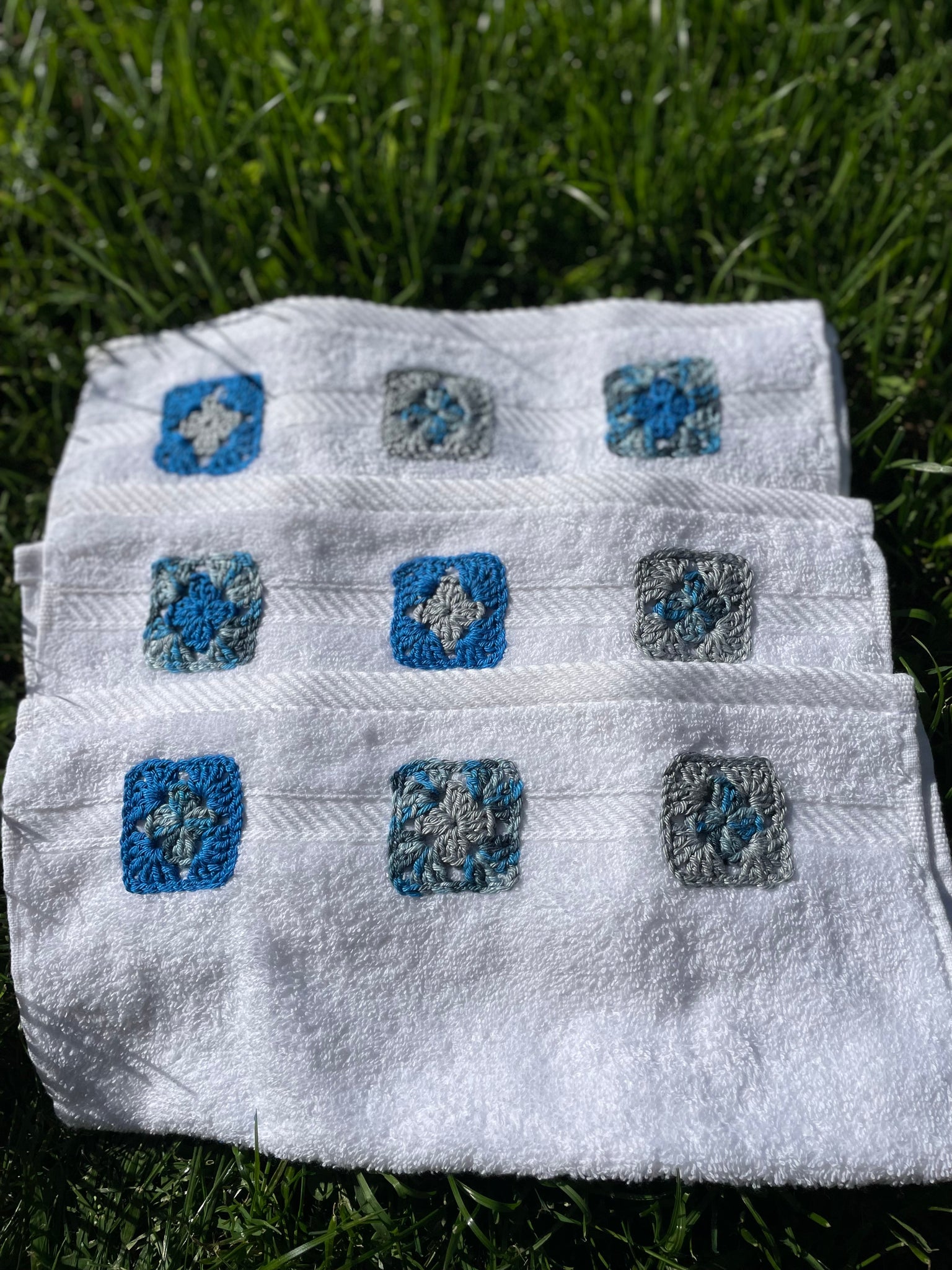 - Handcrafted blue-gray granny square crochet appliques