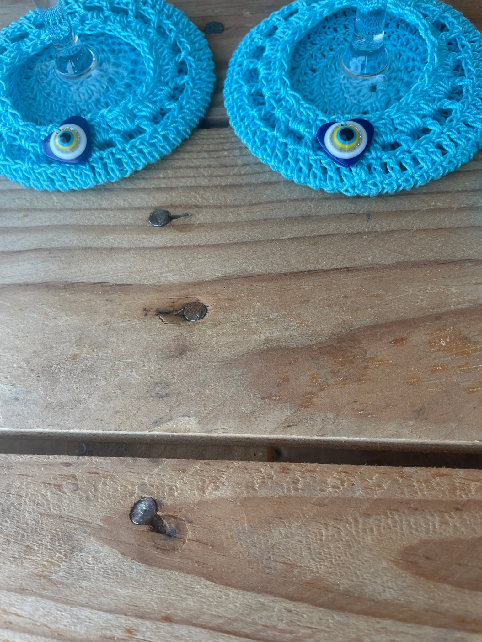 Discover the perfect blend of style and tradition with these stunning cyan cotton crochet wine coasters, each featuring a protective Greek Eye charm. This set of 6 handcrafted coasters brings Mediterranean elegance and ancient symbolism to your dining experience.