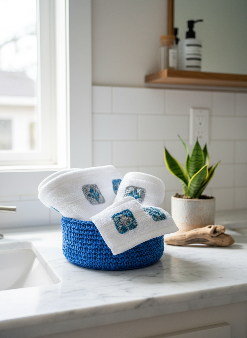 Premium bathroom lifestyle with granny square towels and crochet basket