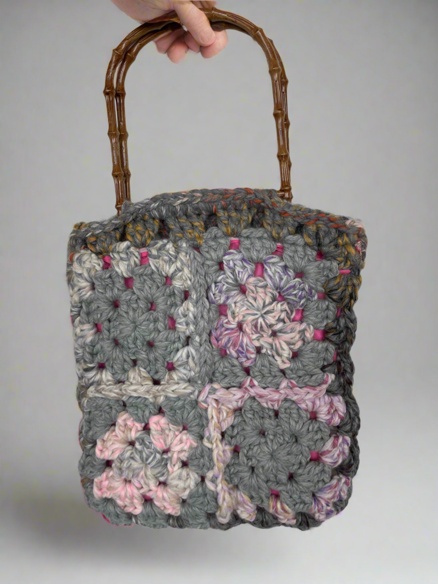 Winter Granny Squares Crochet Bag - Luxurious Pink & Gray Elegance